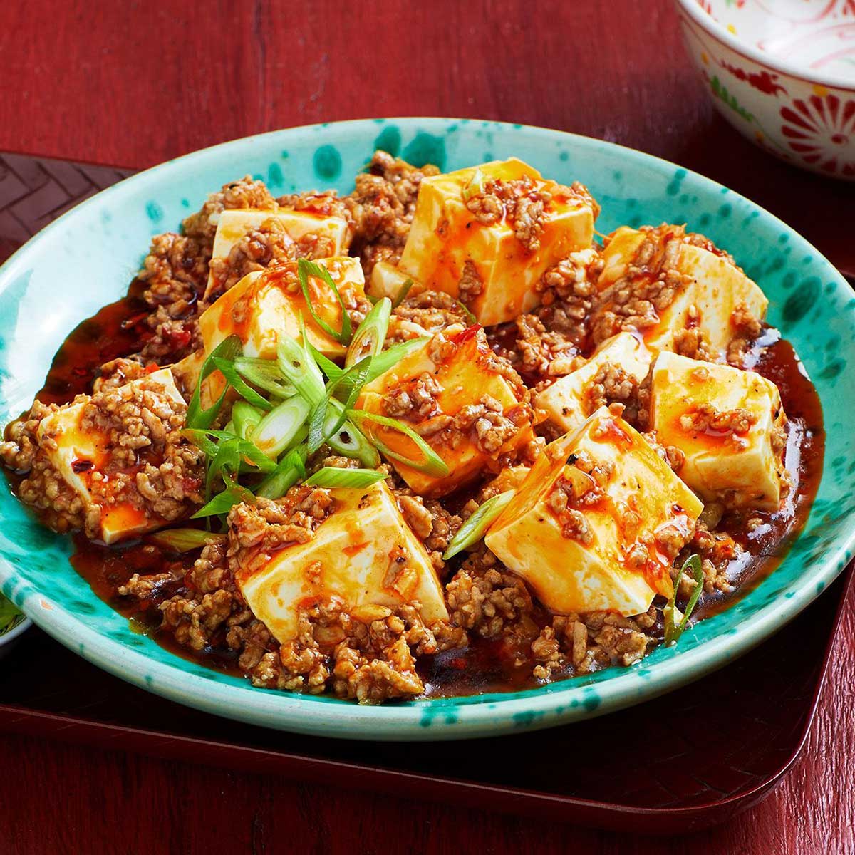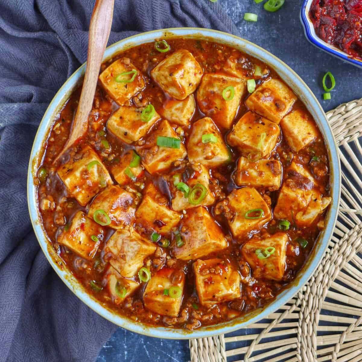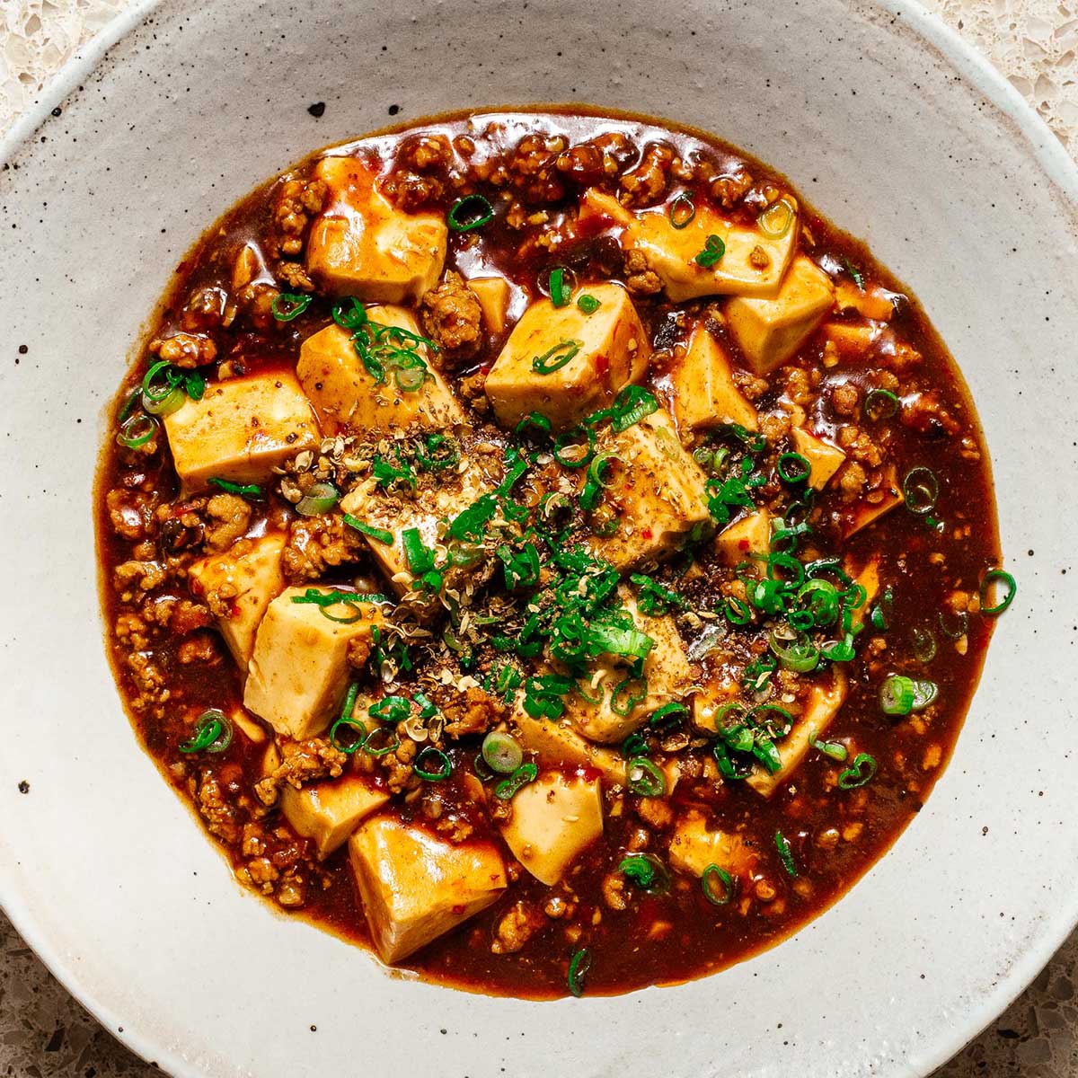 Erősen fűszeres tofuétel darált hússal, tipikus szecsuáni fogás.
