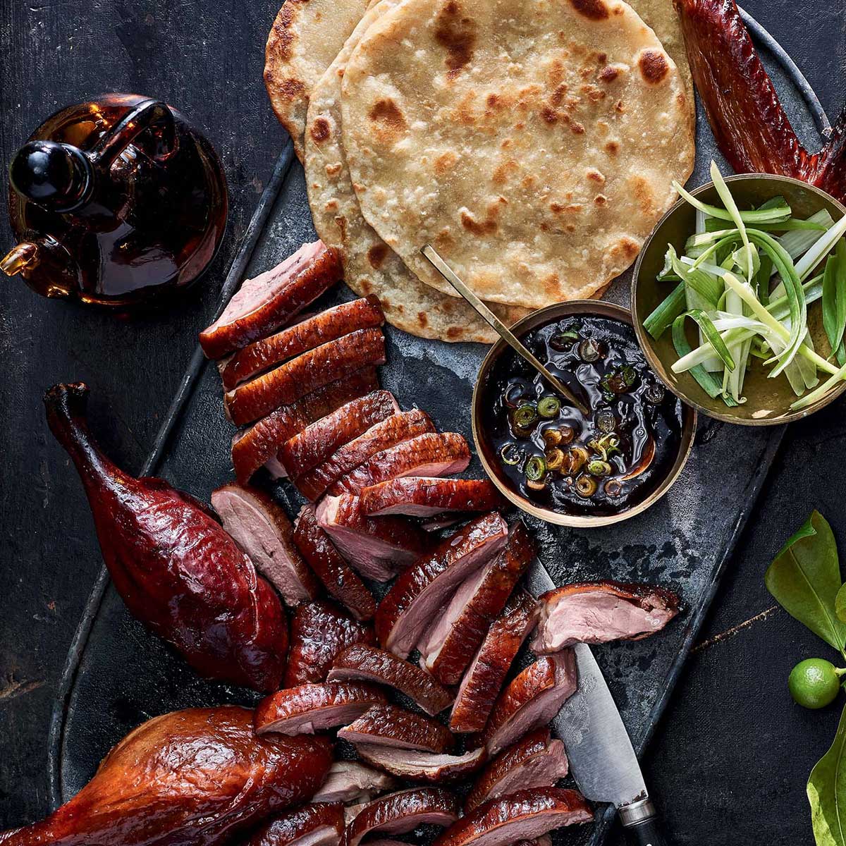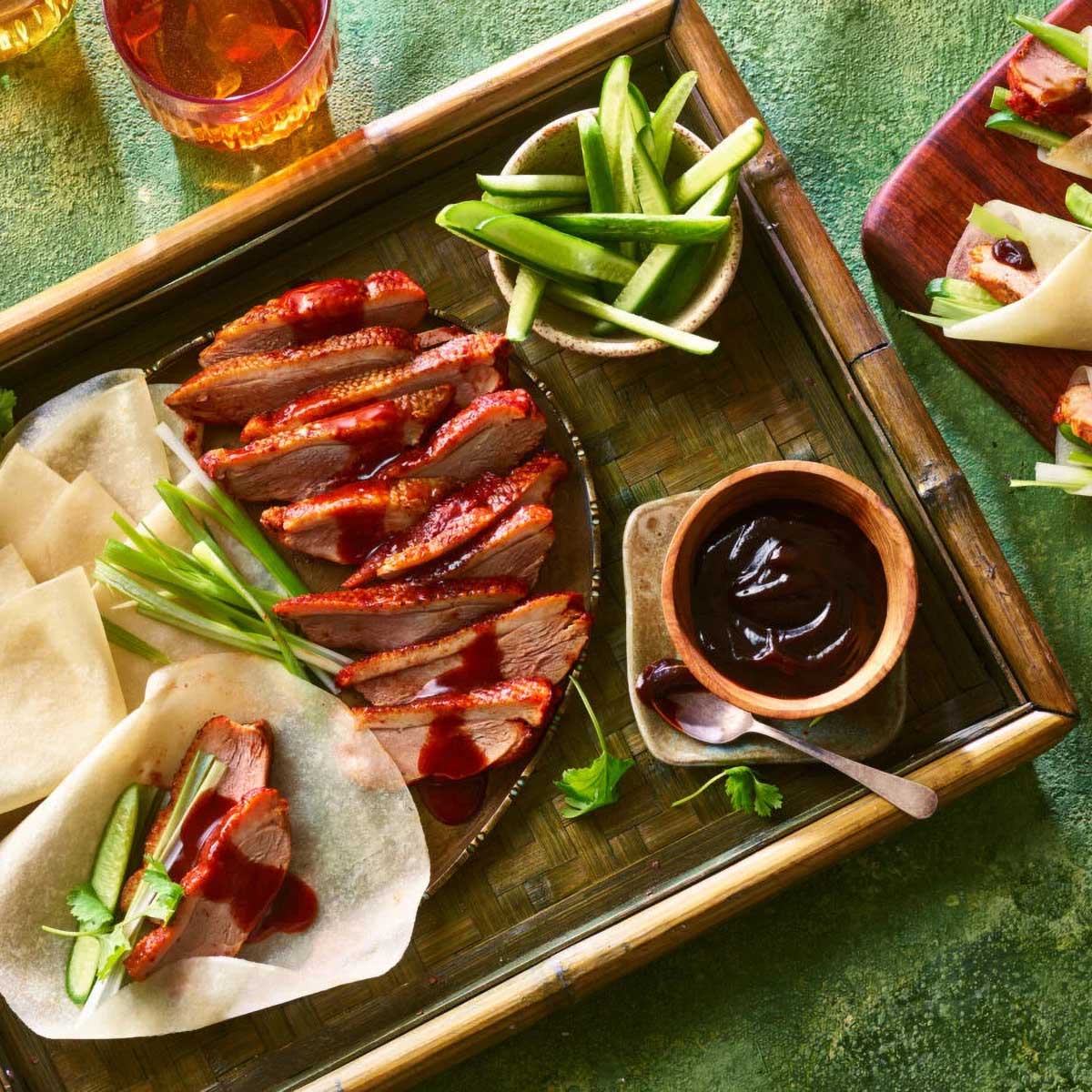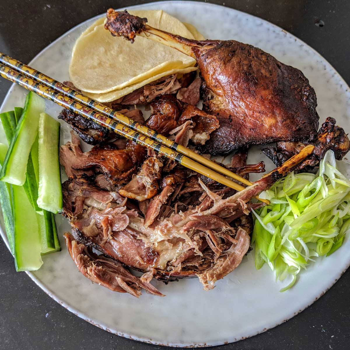 Az egyik legismertebb kínai étel, ropogós bőrével és omlós húsával. Hagyományosan vékony palacsintába tekerve, zöldségekkel és édes-sós szósszal fogyasztják.